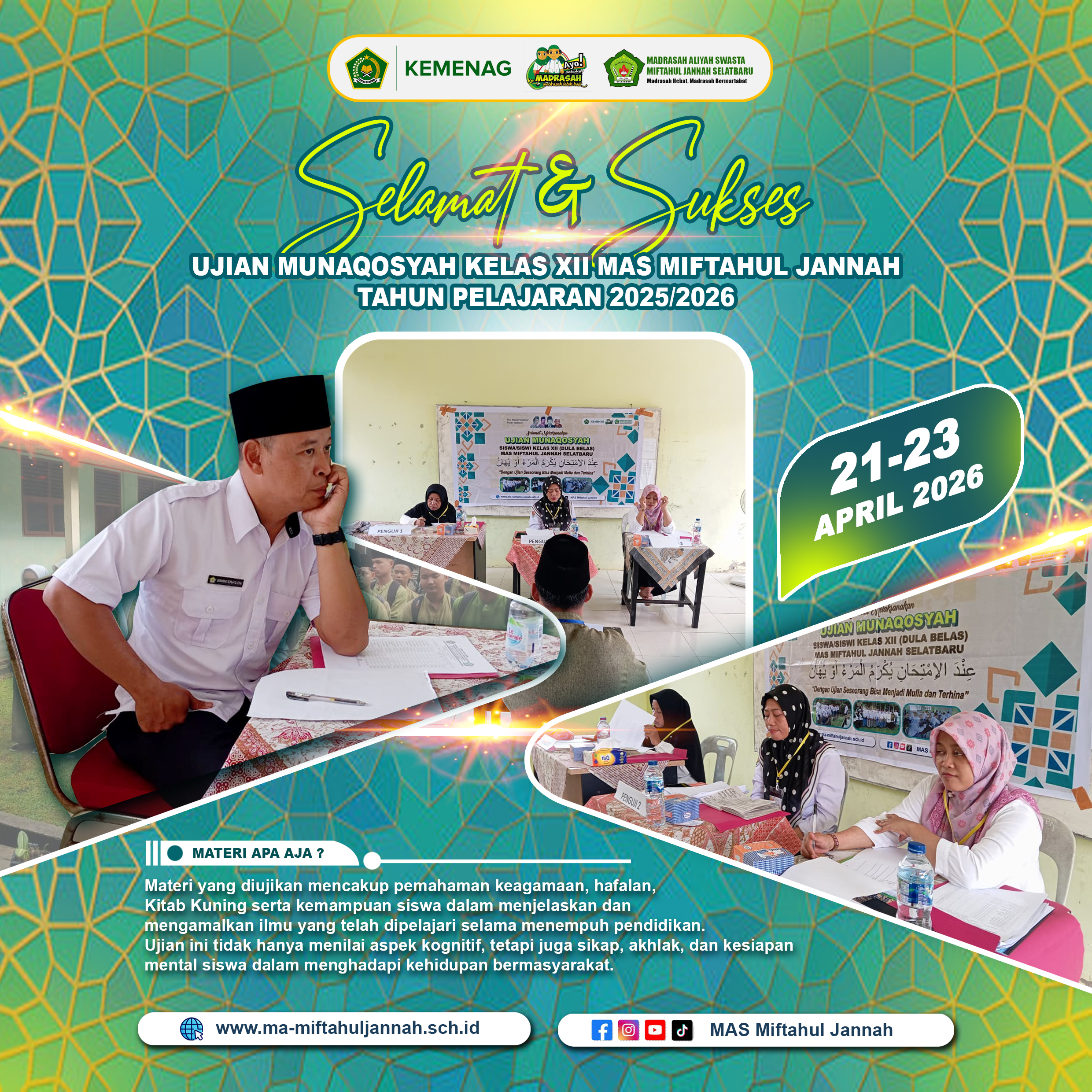 Dengan terselenggaranya ujian munaqosyah ini, diharapkan seluruh siswa kelas XII MAS Miftahul Jannah dapat menyelesaikan pendidikan mereka dengan hasil terbaik dan siap melanjutkan ke jenjang pendidikan yang lebih tinggi maupun terjun ke masyarakat.